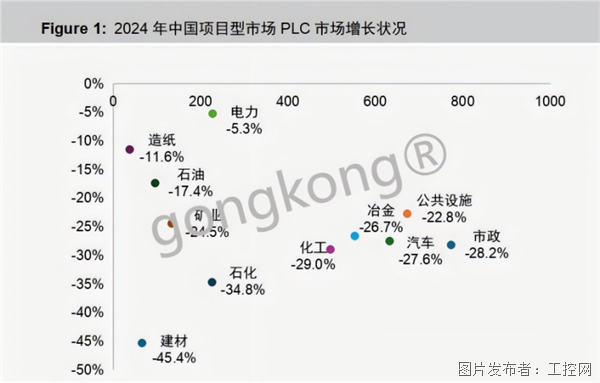 由此,此时的国产替代正在具体行业与项目中切实发生。2024年,中国项目型市场PLC均呈下降趋势,而细分行业的降幅恰恰指明了替代的主战场。gongkong®市场研究多个方面数据显示,化工、市政、汽车、冶金、公共设施五大行业均出现大幅度地下跌,其中: